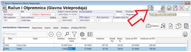 kao nacrt. Takav dokument se snima u bazu podataka ali nema pripadajuća automatska knjiženja.