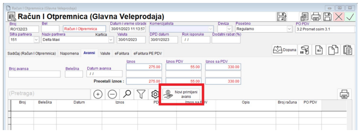 „Novi primljeni avans”, unosite iznos, datum od petka i šaljete avansnu eFakturu na portal SEF. Takva
