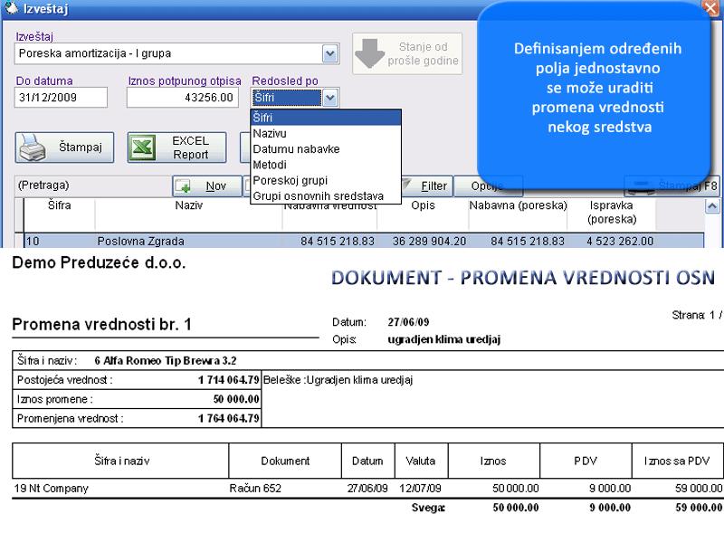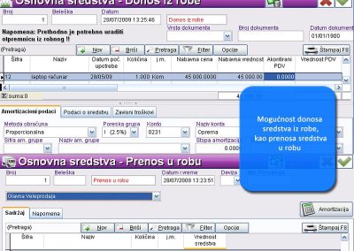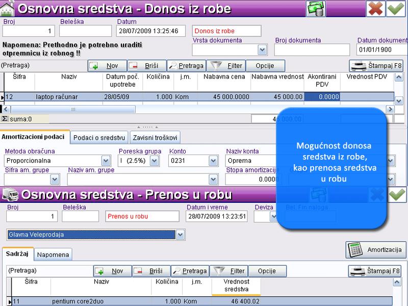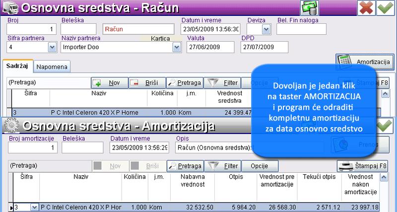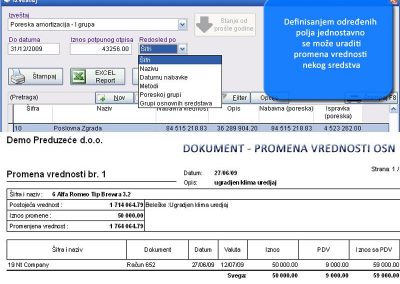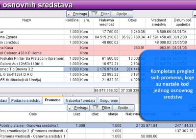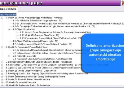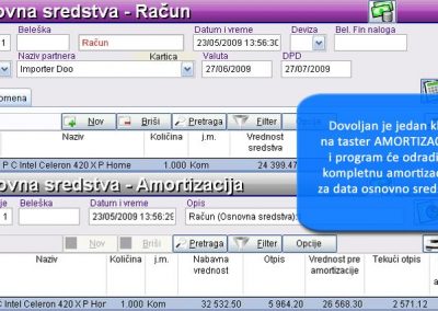 Namenjen je vođenju evidencije osnovnih sredstava . Prevashodno je namenjen firmama koje imaju potrebu da svoja osnovna sredstva vode tj. evidentiraju radi što boljeg poslovanja. Ova aplikacija omogućava da nakon kupovine osnovnog sredstva, sa nabavnom vrednošću i dodelom inventarskog broja, fabričkog broja, kao i amortizacione grupe, izvršite amortizaciju, otpis (prodaju kroz fakturisanje) osnovnog sredstva..U ovoj aplikaciji unete su sve amortizacione grupe. Što se tiče broja osnovnih sredstava ne postoje ograničenja.