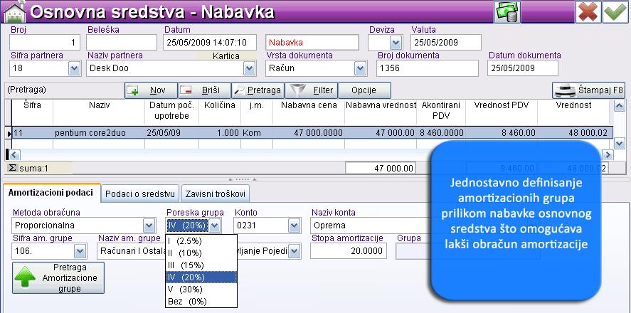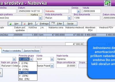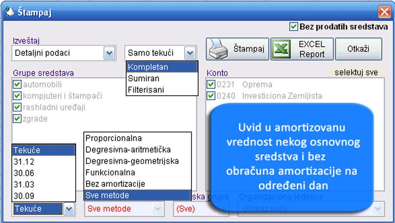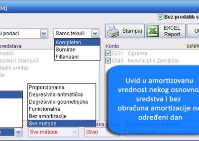 U ovoj aplikaciji postoji mogućnost izbora obračuna metoda amortizacije