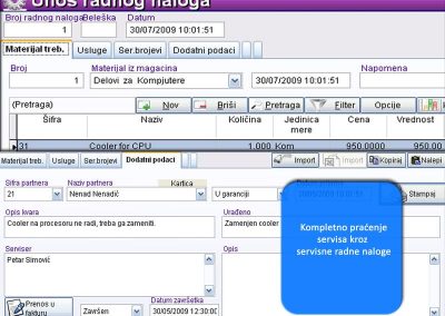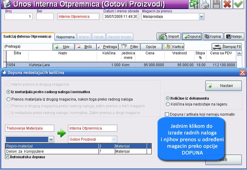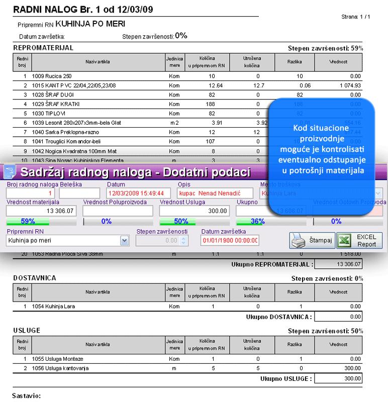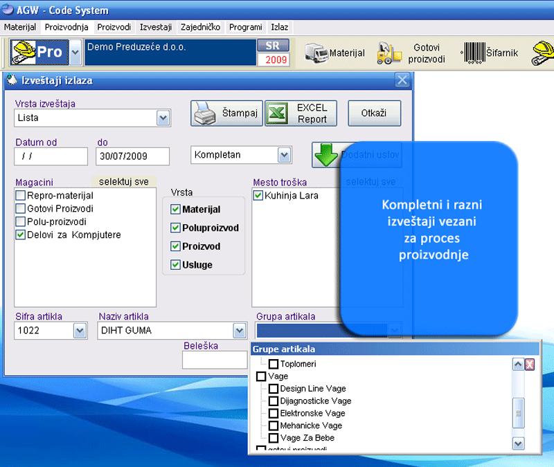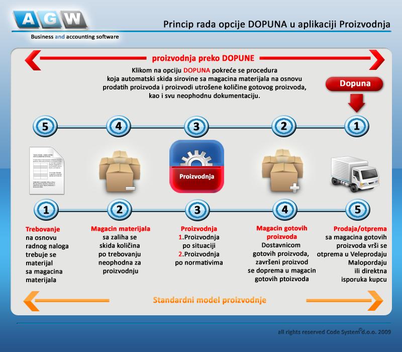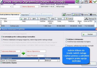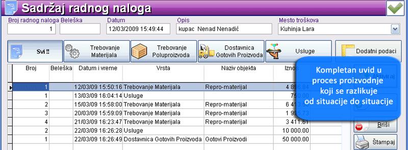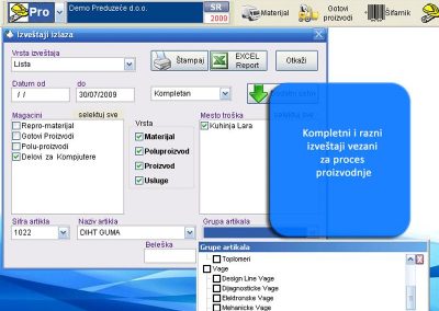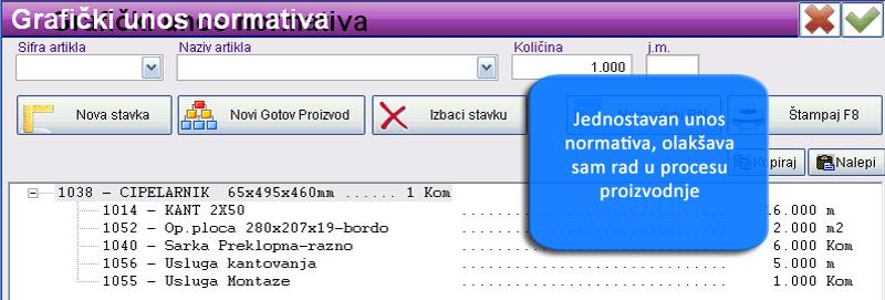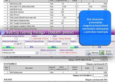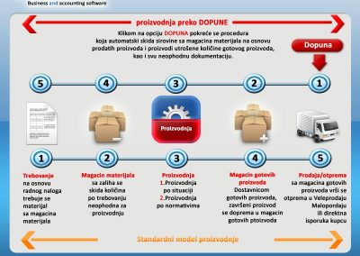 Namenjena je za praćenje kompletnog procesa proizvodnje, od nabavke repromaterijala, njegovog trebovanja preko izrade gotovog proizvoda i plasiranjem istog dirketno iz proizvodnje ili putem maloprodaje ili veleprodajae. U ovoj aplikaciji su sadržani svi potrebni elementi organizovanja proizvodnje.