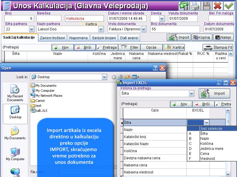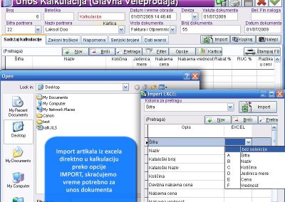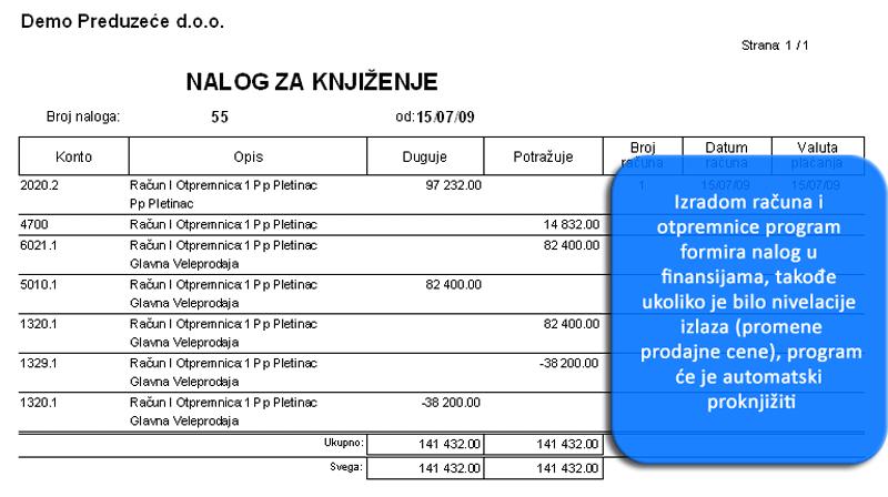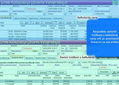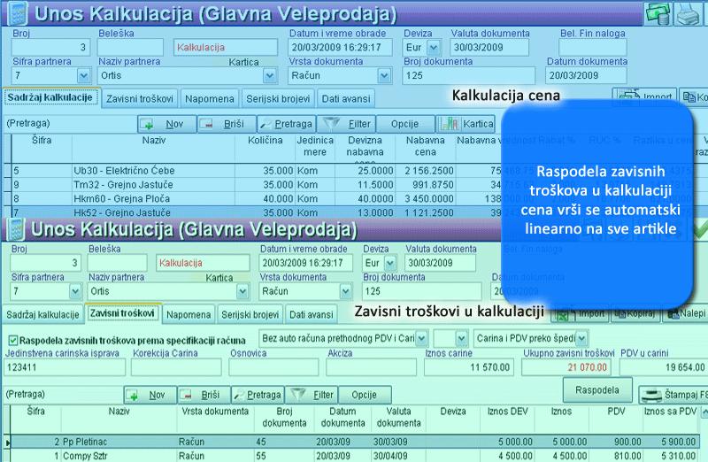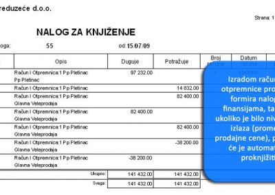 Izradom jednom dokumenta (npr.kalkulacija) program automatski ubacuje dati dokument u knjige (KEPU,KPR), na lager,  gde formira robnu karticu posebno za svaki artikal, kao i  u glavnu knjigu.